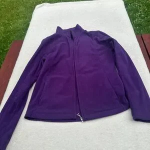 Cozy purple fleece jacket with a zip-up front. Perfect for layering.