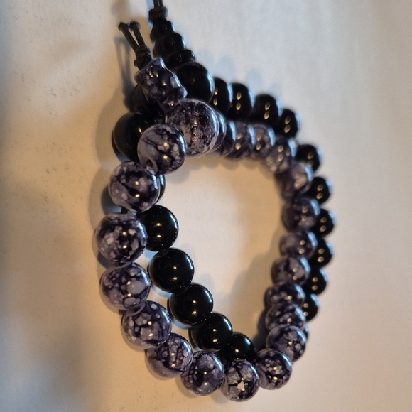 This stunning bracelet features a captivating mix of black and purple beads, each with a smooth, polished surface. The circular design is crafted from semi-transparent materials, allowing light to beautifully accentuate its vibrant colors. Ideal for adding a touch of sophistication to any outfit. may need restring but still ok