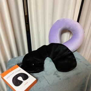 Comfortable travel neck pillow set in purple and black. Ideal for long journeys