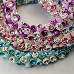 Glistening rows of purple and white iridescent gems, pronged in place by same colored fittings, bonded together in a stretchy band, creating a dazzling infinity wrap style bracelet around the wrist.