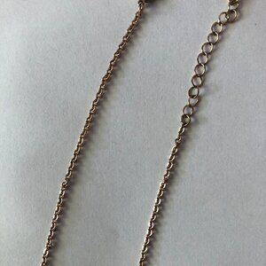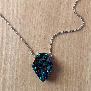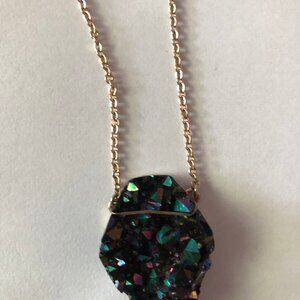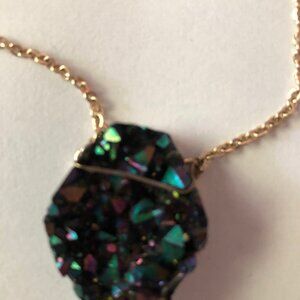It is a nice Purple and blue iridescent pendant with a gold-tone metal chain necklace 26"-29" long in very good pre-owned condition.