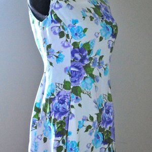 This purple & blue floral dress has a classic round neckline, with an A-line princess shape with double seams down the front and back. This dress fastens with a metal zipper down the back and has pleating down the front waistline for more of a bell shape.