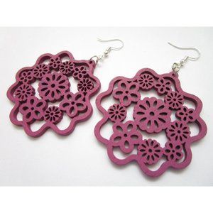 Dark Purple carved large flower wooden earrings - wood painted jewelry - flower earring - hobo earring - stainless steel nickel free wood earrings - stainless steel nickel free earring hooks, painted wooden hobo dangles, hippie dangles.
