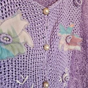 Purple hook cardigan oversize 80's with ornaments of flowers and pearls. Foresee that this sweater is not light but It's just spectacular. No tag. Estimate size xl because it's oversized. Very good condition.