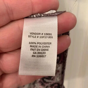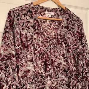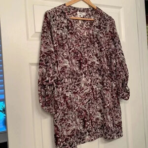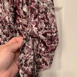 Shades of purple, grey and white small abstract print. V neck and button front Tunic blouse. 3/4 sleeves with tie ups. Light and flowy fabric. Size Small. In immaculate condition.