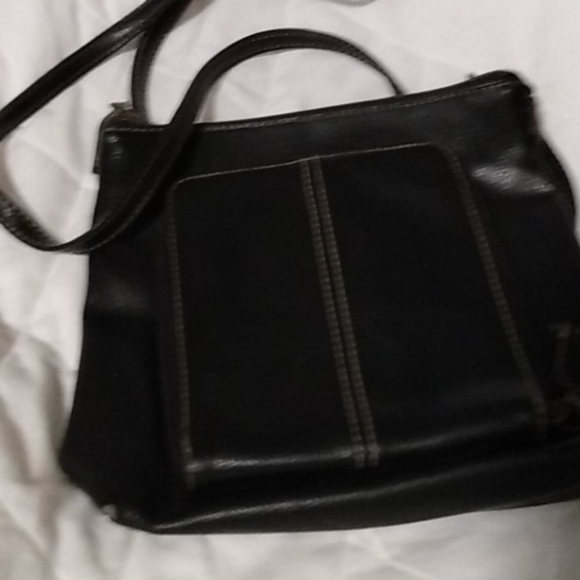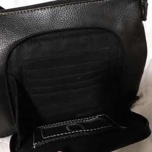 Black stitching detail with built in wallet Has inside pocket as well . Zipper fob is a little worn..body in great shape