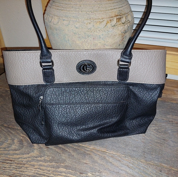 Faux Leather, beautiful purse. New, used a couple of times. Lots of compartments, zippers work. No scuffs or tears. 15" wide x 10" high approximately