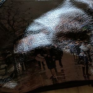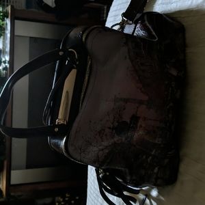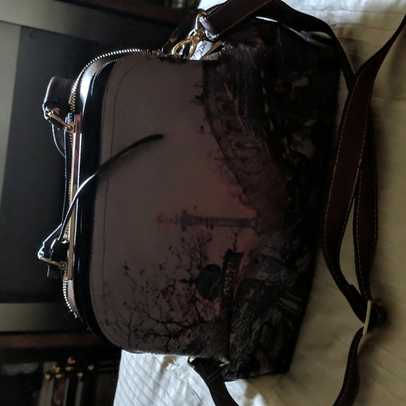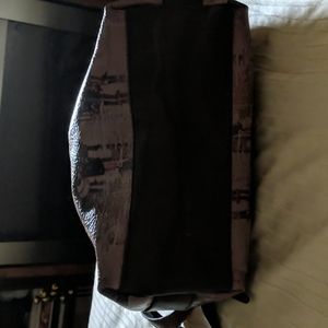 a 2 sided purse with images . it is multi colored. brown and beige being the major color.