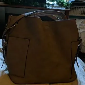 a large beige purse 2 large pockets on outside . very pretty. I don't know the brand. it