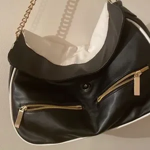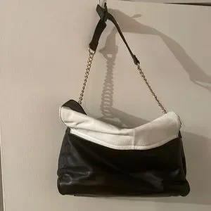 Avon,Black and white purse non leather but still very nice has 2 large compartment’s inside and a smaller one and 2 zipper compartment’s in front.
