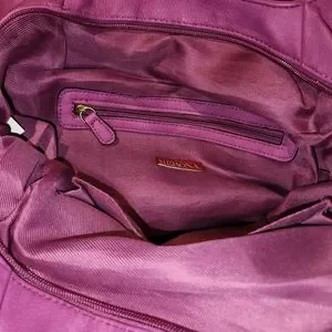 magenta shoulder bag 3 sections, magnetic closures, zippered middle section with smaller zippered pocket