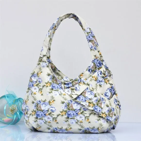 Zipped handbag with handles and side zipper. Brand : Unknown. Fabric : mixed polyester canvas. Color : Ivory flower print. Size : 25 cm long x 8 cm large x 13 cm high.