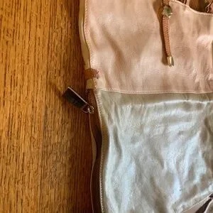 Soft Italian leather shoulder, clutch and carry handbag in lovely taupe and dusty pink, zippered bottom, light tan handles, can be used folded as clutch. In new condition, never used.