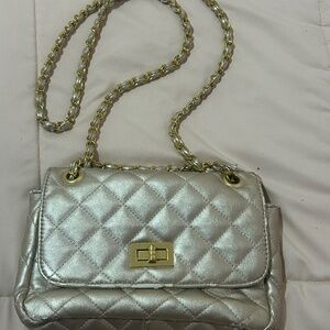 Midsize metallic gold Bach Couture purse with front clasp. Woven strap. Zippered storage pouches.