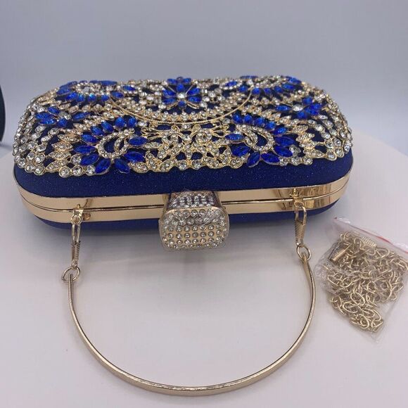 Purse, clutch, shoulder chain, deep blue, gold metal, blue and clear gems, NWOT