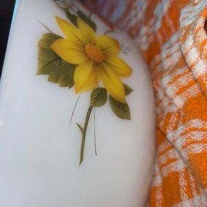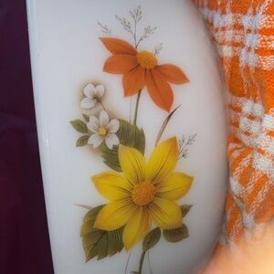 Design: Features a distinctive orange and yellow floral design on a milky white opal glass background.