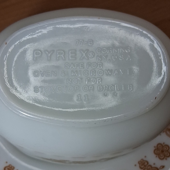 Elegant Pyrex gravy boat with matching saucer. Features a white base with gold floral design. Perfect for serving sauces and gravies.