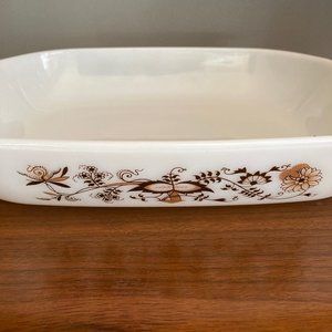 Shades of Brown Vines pattern. Pyrex England mark. 11 x 9 inch casserole (interior measurements). Very good condition, with no pattern fading, chips, or major scratches. Very clean. Classic 1970s pattern.