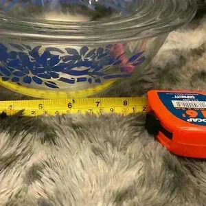 Pyrex clear glass vintage MCM nesting mixing bowls with blue ribbons & flowers.
