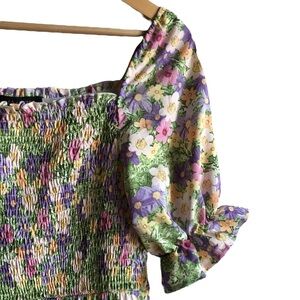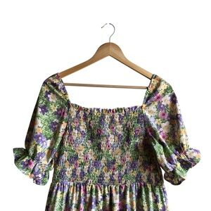 Meet your new favorite warm-weather dress: this QED London floral print maxi combines charm and comfort in a breezy silhouette. Featuring a stretchy shirred bodice and puff sleeves with delicate ruffles, this dress hugs the upper body before flowing into a full, floaty skirt. The pastel floral pattern—purple, pink, yellow, and white blooms on a soft green background—brings a romantic, vintage-inspired vibe. Whether you’re heading to a picnic, brunch, or beachside stroll, this dreamy dress offers the perfect blend of femininity and ease.