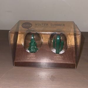 New in box QUALY cactus and evergreen tree summer and winter salt and pepper shakers.