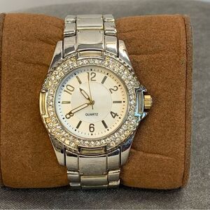 QUARTZ stainless steel round face crystal rhinestone trim watch