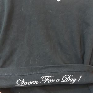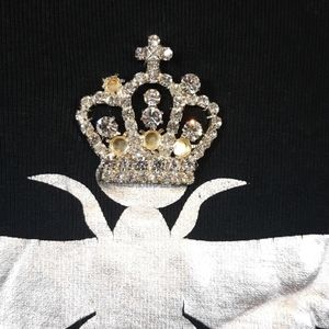 Queen Bee tee designed by Jan Haedrich for My Flat In London. Size XL, 22" shoulder to hem and 16" armpit to armpit. Features rhinestone crown, hidden message on inside and on sleeve. Black