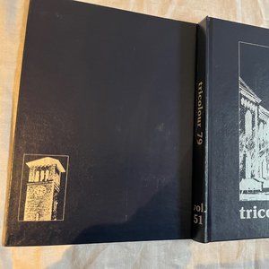 QUEENS TRICOLOUR University hard cover year book for 1979 in excellent preowned vintage condition. Been stored safely on shelf for years in smoke-free and pet-free home. Just some minor surface and edge wear. Great Queen's University, Kingston Ontario, Canada collectible for display or coffee table with fab vintage 70's photos and memories of Oil Thigh days, Alumni and Alma Mater. Measures approximately 12.5 x 9.5 inches. Oil Thigh!