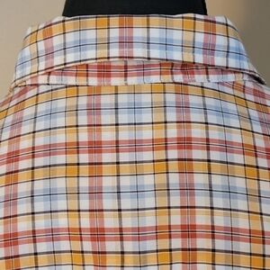 Quiksilver men's short sleeved button-down shirt. Yellow, red, white, black and blue in color.
