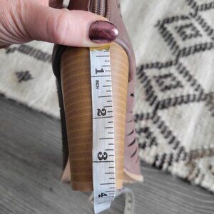 These are such cute booties! They are light brown ankle booties with zippers up the back and little peep-toes that will work perfectly for the office or out on the town. They are 7.5 and have maybe been worn once. The heel height is 3.75 inches.