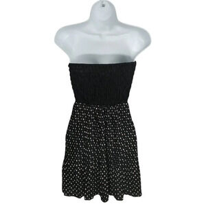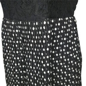 Black lace top. Stretchy fabric, with back rusched with elastic. Delicate lone of sheer lace along front top. Sleeveless and strapless. Pleated black with white polka dot skirt. Black lining. Plastic line along top of dress to prevent sliding.