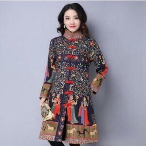 Qianbaiy Chinese Style Printed Quilted Long Coat Jacket S