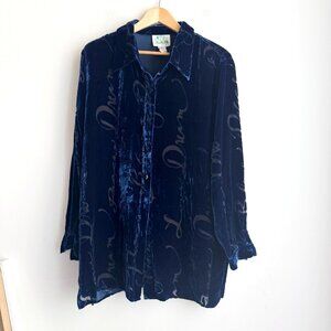 Quacker Factory Burnt out Velvet Spellout BLlue Silk Blend Button Down Shirt L.