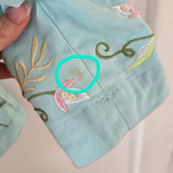 There's a stain on the right cuff and a tiny pinkish stain on the front jacket, refer to last 2 photos.