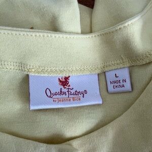 Quacker Factory t-shirt. Button up, so could also be worn as a cardigan sweater. Beautiful light yellow colour with faux gem snaps. Mix of embroidery, rhinestones for the beach print on the bottom front. Really stunning and classy for the summer!