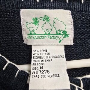 Festive Quacker Factory knit cardigan in navy blue with embroidered snowmen and snowflakes. Knit with button front — perfect cheerful layer for cozy holiday gatherings.