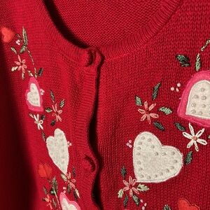 Quacker Factory embroidered knit cardigan,red button front,hearts,sequins,felt