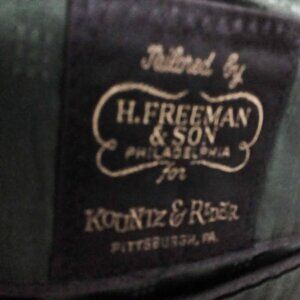 Vintage grey pinstripe suit with functioning buttons on surgeon's cuffs. (Colour is lighter than photo shows) Tailored by H Freeman & Son. It's 100% wool and I believe fully canvassed. Size 46S Was altered to narrow pant legs. Pants are unpleated.