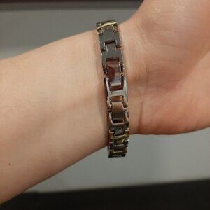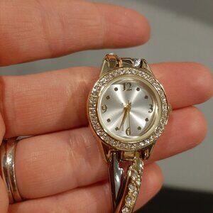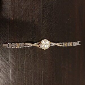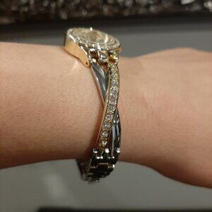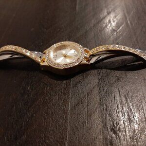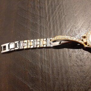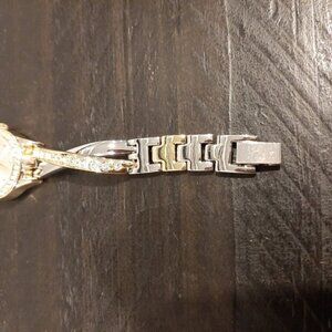 Quartz Wrist Watch Silver Gold Plated Crossover Link Rhinestone Stainless Steel