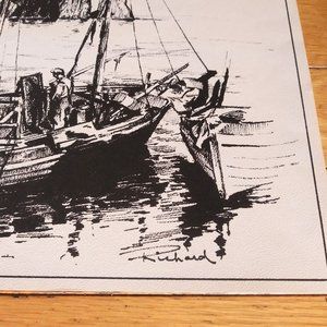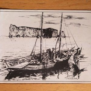 Absolutely beautiful vintage, Persée, Québec engraving, ink print on paper signed "Richard". It's been bought in 1972 in Quebec City, Québec, Canada. It is named "Barques de Pêche à Persée". It is not framed. We can really see very well the famous Rocher Persée in the back of the scenery, and 2 fishermen's boats in the front. The details are amazing. You can really look at this for hours, this is a great nautical print. Since it's never been framed the edge shows a little bit of wear, consistent with age. Please see pictures. Non smoker home.