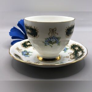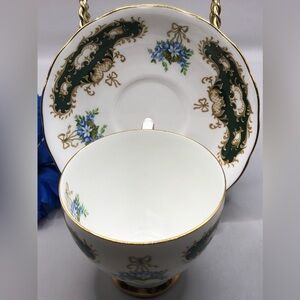 This teacup set features large dark green (evergreen) Scrolls with small bouquets of blue flowers placed throughout. A nice subtle gold gilding and gold foot of the pedestal teacup.
