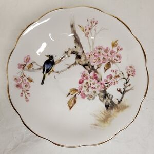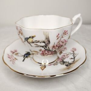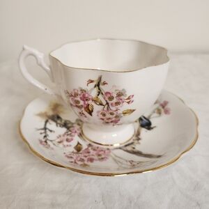 White fine bone china teacup & saucer with pink floral cherry blossom tree and bird design, by Queen Anne.