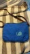 Queen Bee Creations from Portland, Oregon (sadly out of business) fabric purse with adjustable leather strap. Purse is royal blue, leather whale is light greenish blue, strap is brown. The inner nylon lining is light gray and there are two pockets on the inside.