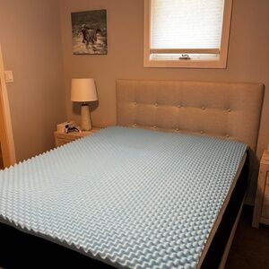 Brand new, never used. Queen-size 2-inch memory foam topper infused with cooling gel for hot nights, promotes airflow for comfort, CertiPUR-US® certified, and easy to unbox — perfect upgrade for a restful, cool sleep.