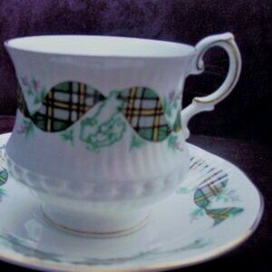 A fine bone china tea cup and saucer, made in England, Queens Rosina #45, featuring Cape Breton tartan. I'm the original owner, receiving this item as a gift 43 years ago. This item has not been used but kept in storage and is in excellent condition. No marks, chips or discolouring. It has had minimal handling, primarily only when reorganizing cupboards and has only been hand-washed.