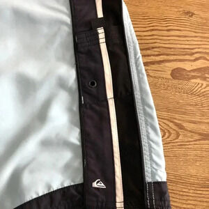 Two tone blue (baby blue and deep navy), black and white stripes. Velcro side pocket. Velcro fly with tie up. Embroidered logo down leg and and on front. 100% polyester. No inside liner.