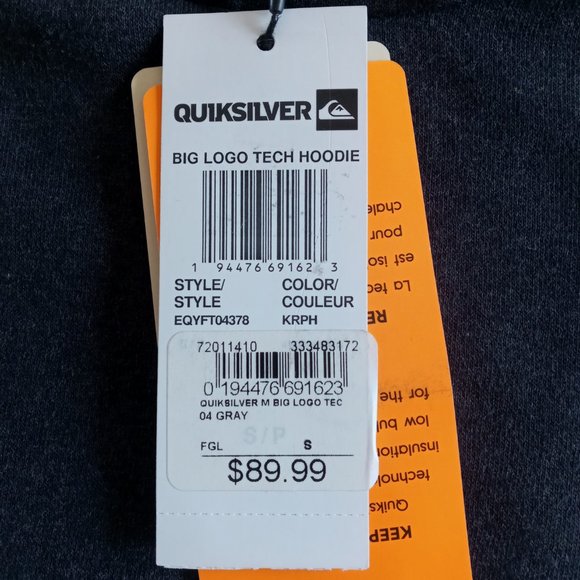 Quiksilver Big Logo Tech Water Repellent grey slate Hoodie Size small N.W.T.