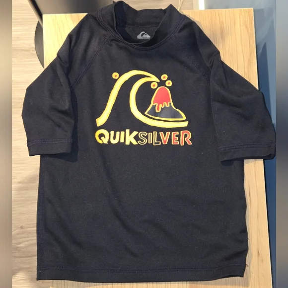 Toddler 4T. Black rash guard with Quiksilver logo. Features yellow and red accents.