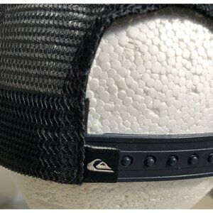This Quiksilver trucker hat features a stylish blue and black design with mesh back for breathability. Its adjustable strap ensures a comfortable fit.