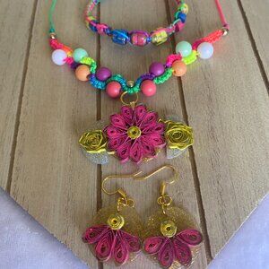 Those are a beautiful handmade jewelry made by a dreamer mother who mainly used quilling paper art as a craft technique. Each piece was carefully crafted rolling manually each paper strips with quilling paper tool, then the shape was given and patiently glued and then add some design details as a shiny, beads, foil etc. At the end of the process the whole piece was carefully coated with polish. Then the entire piece was assembled with jewelry glue (B-7000) on the previously made glitter hot glue base. This base also was coating with polish to protect the piece from heat, water and constant handling. Subsequently, a hole was made in the center of the pendant and then the jewelry material was assembled to give the final touch to the piece.